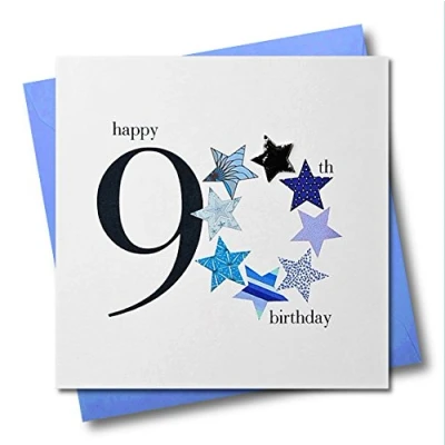 DIMENSIONS: 150x150mm CAPTION: Happy 90th Birthday EMBELLISHMENT: Padded Silver Star BLANK INSIDE: Space inside for your own message MADE IN THE UK: Designed, printed and finished in the UK HIGH-QUALITY: Printed on top quality heavy 350gsm card stock, with envelope included SUSTAINABLE: Comes wrapped in Compostable bag or with a card catch label. Both the greetings card & envelope are sustainably sourced and recyclable STANDARD LETTER SIZE: Can be sent with Royal Mail standard letter stamps