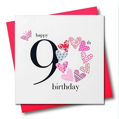 DIMENSIONS: 150x150mm CAPTION: Happy 90th Birthday EMBELLISHMENT: Fabric Pink Butterfly BLANK INSIDE: Space inside for your own message MADE IN THE UK: Designed, printed and finished in the UK HIGH-QUALITY: Printed on top quality heavy 350gsm card stock, with envelope included SUSTAINABLE: Comes wrapped in Compostable bag or with a card catch label. Both the greetings card & envelope are sustainably sourced and recyclable STANDARD LETTER SIZE: Can be sent with Royal Mail standard letter stamps