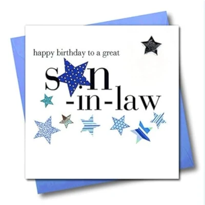 DIMENSIONS: 150x150mm CAPTION: happy birthday to a lovely son-in-law EMBELLISHMENT: Padded Silver Star BLANK INSIDE: Space inside for your own message MADE IN THE UK: Designed, printed and finished in the UK HIGH-QUALITY: Printed on top quality heavy 350gsm card stock, with envelope included SUSTAINABLE: Comes wrapped in Compostable bag or with a card catch label. Both the greetings card & envelope are sustainably sourced and recyclable STANDARD LETTER SIZE: Can be sent with Royal Mail standard letter stamps
