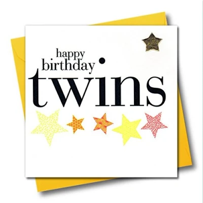 DIMENSIONS: 150x150mm CAPTION: Happy Birthday Twins EMBELLISHMENT: Gold Padded Star BLANK INSIDE: Space inside for your own message MADE IN THE UK: Designed, printed and finished in the UK HIGH-QUALITY: Printed on top quality heavy 350gsm card stock, with envelope included SUSTAINABLE: Comes wrapped in Compostable bag or with a card catch label. Both the greetings card & envelope are sustainably sourced and recyclable STANDARD LETTER SIZE: Can be sent with Royal Mail standard letter stamps