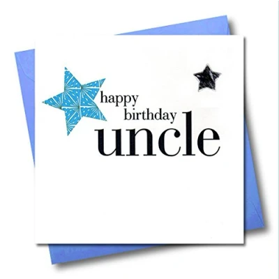 DIMENSIONS: 150x150mm CAPTION: Happy Birthday Uncle EMBELLISHMENT: Padded Silver Star BLANK INSIDE: Space inside for your own message MADE IN THE UK: Designed, printed and finished in the UK HIGH-QUALITY: Printed on top quality heavy 350gsm card stock, with envelope included SUSTAINABLE: Comes wrapped in Compostable bag or with a card catch label. Both the greetings card & envelope are sustainably sourced and recyclable STANDARD LETTER SIZE: Can be sent with Royal Mail standard letter stamps