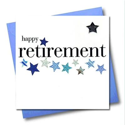 DIMENSIONS: 150x150mm CAPTION: Happy Retirement EMBELLISHMENT: Padded Silver Star BLANK INSIDE: Space inside for your own message MADE IN THE UK: Designed, printed and finished in the UK HIGH-QUALITY: Printed on top quality heavy 350gsm card stock, with envelope included SUSTAINABLE: Comes wrapped in Compostable bag or with a card catch label. Both the greetings card & envelope are sustainably sourced and recyclable STANDARD LETTER SIZE: Can be sent with Royal Mail standard letter stamps