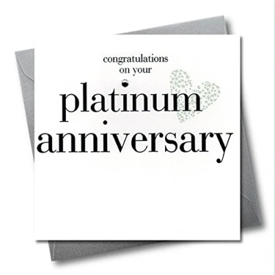 DIMENSIONS: 150x150mm CAPTION: Congratulations on your Platinum Anniversary EMBELLISHMENT: Silver Gem BLANK INSIDE: Space inside for your own message MADE IN THE UK: Designed, printed and finished in the UK HIGH-QUALITY: Printed on top quality heavy 350gsm card stock, with envelope included SUSTAINABLE: Comes wrapped in Compostable bag or with a card catch label. Both the greetings card & envelope are sustainably sourced and recyclable STANDARD LETTER SIZE: Can be sent with Royal Mail standard letter stamps