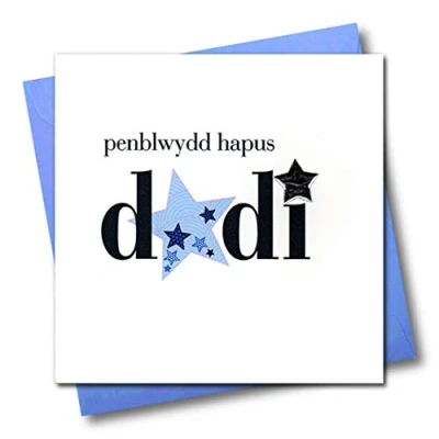DIMENSIONS: 150x150mm CAPTION: Penblwydd Hapus Dadi ENGLISH TRANSLATION: Happy Birthday to Daddy EMBELLISHMENT: Padded Silver Star BLANK INSIDE: Space inside for your own message MADE IN THE UK: Designed, printed and finished in the UK HIGH-QUALITY: Printed on top quality heavy 350gsm card stock, with envelope included SUSTAINABLE: Comes wrapped in Compostable bag or with a card catch label. Both the greetings card & envelope are sustainably sourced and recyclable STANDARD LETTER SIZE: Can be sent with Royal Mail standard letter stamps
