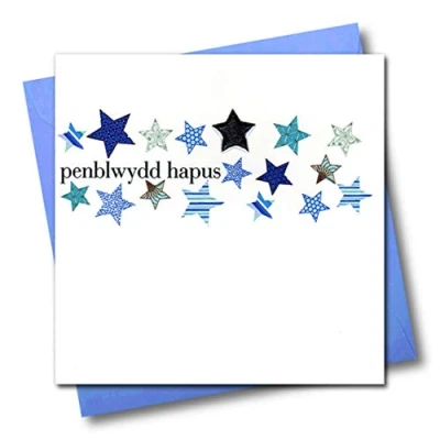 Claire Giles Hearts and Stars Welsh Penblwydd Hapus Blue Happy Birthday Card