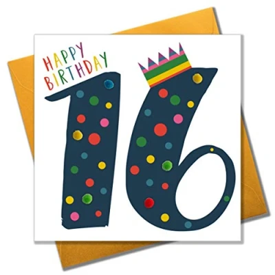 Wording on Front - Happy Birthday 16 Blank inside for your own message Comes cello wrapped in Compostable bag with a vibrant yellow envelope Part of the Pompom range. Printed and hand finished in the U.K with beautiful colourful pompom embellishments.