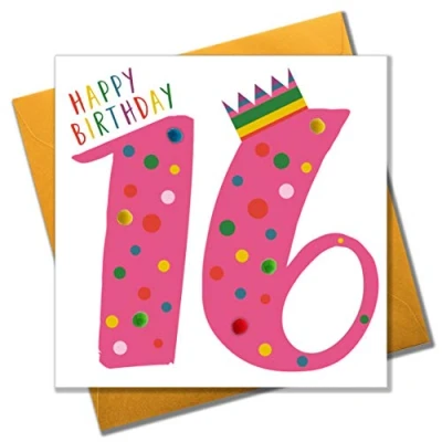 Amazon Wording on Front - Happy Birthday 16 Blank inside for your own message Comes cello wrapped in Compostable bag with a vibrant yellow envelope Part of the Pompom range. Printed and hand finished in the U.K with beautiful colourful pompom embellishments.