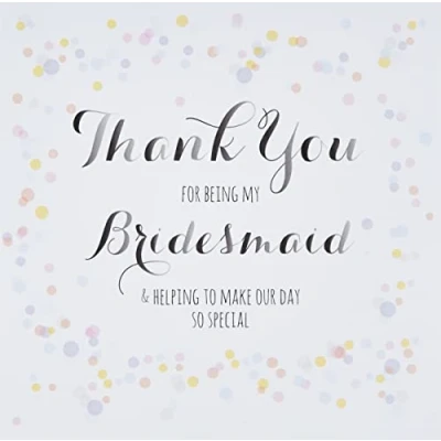 DIMENSIONS: 150x150mm CAPTION: Thank you for being my Bridesmaid BLANK INSIDE: Space inside for your own message MADE IN THE UK: Designed, printed and finished in the UK HIGH-QUALITY: Printed on top quality heavy 350gsm card stock, with envelope included SUSTAINABLE: Comes wrapped in Compostable bag or with a card catch label. Both the greetings card & envelope are sustainably sourced and recyclable STANDARD LETTER SIZE: Can be sent with Royal Mail standard letter stamps