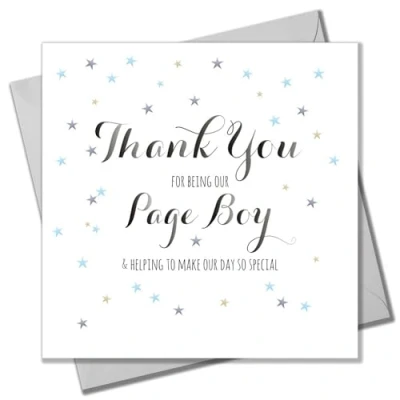 DIMENSIONS: 150x150mm CAPTION: Thank you for being our Page Boy BLANK INSIDE: Space inside for your own message MADE IN THE UK: Designed, printed and finished in the UK HIGH-QUALITY: Printed on top quality heavy 350gsm card stock, with envelope included SUSTAINABLE: Comes wrapped in Compostable bag or with a card catch label. Both the greetings card & envelope are sustainably sourced and recyclable STANDARD LETTER SIZE: Can be sent with Royal Mail standard letter stamps