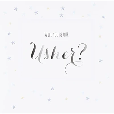 DIMENSIONS: 150x150mm CAPTION: Will you be our Usher? BLANK INSIDE: Space inside for your own message MADE IN THE UK: Designed, printed and finished in the UK HIGH-QUALITY: Printed on top quality heavy 350gsm card stock, with envelope included SUSTAINABLE: Comes wrapped in Compostable bag or with a card catch label. Both the greetings card & envelope are sustainably sourced and recyclable STANDARD LETTER SIZE: Can be sent with Royal Mail standard letter stamps