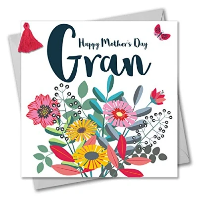 DIMENSIONS: 150x150mm CAPTION: Happy Mother's Day, Gran EMBELLISHMENT: Pink Tassel BLANK INSIDE: Space inside for your own message MADE IN THE UK: Designed, printed and finished in the UK HIGH-QUALITY: Printed on top quality heavy 350gsm card stock, with envelope included SUSTAINABLE: Comes wrapped in Compostable bag or with a card catch label. Both the greetings card & envelope are sustainably sourced and recyclable STANDARD LETTER SIZE: Can be sent with Royal Mail standard letter stamps