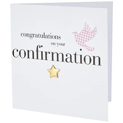 DIMENSIONS: 150x150mm CAPTION: congratulations on your confirmation EMBELLISHMENT: Gold Padded Star BLANK INSIDE: Space inside for your own message MADE IN THE UK: Designed, printed and finished in the UK HIGH-QUALITY: Printed on top quality heavy 350gsm card stock, with envelope included SUSTAINABLE: Comes wrapped in Compostable bag or with a card catch label. Both the greetings card & envelope are sustainably sourced and recyclable STANDARD LETTER SIZE: Can be sent with Royal Mail standard letter stamps