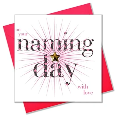 DIMENSIONS: 150x150mm CAPTION: naming day EMBELLISHMENT: Gold Padded Star BLANK INSIDE: Space inside for your own message MADE IN THE UK: Designed, printed and finished in the UK HIGH-QUALITY: Printed on top quality heavy 350gsm card stock, with envelope included SUSTAINABLE: Comes wrapped in Compostable bag or with a card catch label. Both the greetings card & envelope are sustainably sourced and recyclable STANDARD LETTER SIZE: Can be sent with Royal Mail standard letter stamps