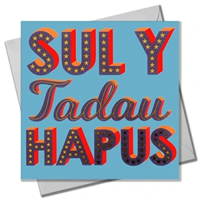 DIMENSIONS: 150x150mm CAPTION: Sul y Tadau Hapus ENGLISH TRANSLATION: Happy Father's Day EMBELLISHMENT: Foil detail with Shiny Gold BLANK INSIDE: Space inside for your own message MADE IN THE UK: Designed, printed and finished in the UK HIGH-QUALITY: Printed on top quality heavy 350gsm card stock, with envelope included SUSTAINABLE: Comes wrapped in Compostable bag or with a card catch label. Both the greetings card & envelope are sustainably sourced and recyclable STANDARD LETTER SIZE: Can be sent with Royal Mail standard letter stamps