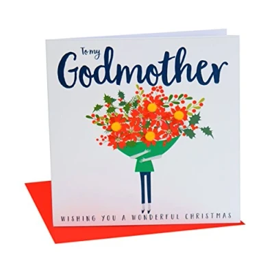 DIMENSIONS: 150x150mm CAPTION: To my Godmother, Wishing you a wonderful Christmas EMBELLISHMENT: Colourful Pompoms BLANK INSIDE: Space inside for your own message MADE IN THE UK: Designed, printed and finished in the UK HIGH-QUALITY: Printed on top quality heavy 350gsm card stock, with envelope included SUSTAINABLE: Comes wrapped in Compostable bag or with a card catch label. Both the greetings card & envelope are sustainably sourced and recyclable STANDARD LETTER SIZE: Can be sent with Royal Mail standard letter stamps