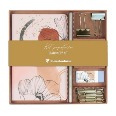 Clairefontaine 115984C un Kit de Papeterie contenant Carnet 11x17 cm 64 Pages Lignées, Crayon Papier, 2 Pinces Doubles Clip, 10 Trombones et une Gomme Collection Evanescence