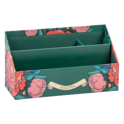 PRACTICAL: This letter holder is ideal for keeping your letters and invoices tidy, whether in the office or at home. FORMAT: This letter holder measures 25 cm long, 10 cm wide and 14 cm high. FRIDA KAHLO DECOR: Designs adorned with floral motifs and vibrant Colours reflect FRIDA KAHLO's energy and passion, recalling the abundant nature that surrounded her and fed her imagination. SOLID AND DURABLE: Made from 2mm-thick rigid cardboard, PEFC-certified for good forest management. HOME OFFICE: Each home office accessory is designed to combine functionality and style to enhance your workspace and make organization easier.