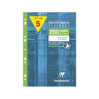 Clairefontaine 17522Cpack Un paquet de 5 Étuis Feuillets Mobiles Perforés A4 21x29,7 cm 200 Pages Petits Carreaux avec Marge Papier Blanc 90 g Étui Réutilisable