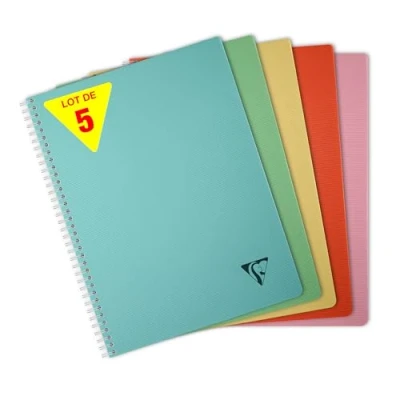 SET OF 5 NOTEBOOKS: ideal for school lists, schools and communities. ALTERNATIVE COLOURS: lagoon blue, sage green, straw yellow, madder red or petal pink. NATURAL AND DELIGHTFUL COLOURS to match your decor! THICK, TRANSLUCENT POLYPRO COVER: for great resistance to handling, with a grooved texture for an original feel and premium finish. GRAND FORMAT: the standard, for a greater surface area for expression SWEET WRITING: SUPERIOR QUALITY Clairefontaine White Velvet Vellum 90 g/m² paper with remarkable opacity and strength. REINFORCED WHITE DOUBLE SPIRAL: allows full aperture, ideal for double-sided sheet use MADE IN FRANCE and PEFC CERTIFIED: for sustainable forest management