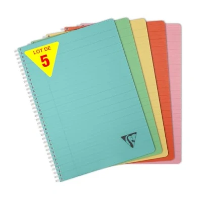 SET OF 5 NOTEBOOKS: ideal for school lists, schools and communities. ALTERNATIVE COLOURS: lagoon blue, sage green, straw yellow, madder red or petal pink. NATURAL AND DELIGHTFUL COLOURS to match your decor! THICK, TRANSLUCENT POLYPRO COVER: for great resistance to handling, with a grooved texture for an original feel and premium finish. GRAND FORMAT: the standard, for a greater surface area for expression SWEET WRITING: SUPERIOR QUALITY Clairefontaine White Velvet Vellum 90 g/m² paper with remarkable opacity and strength. REINFORCED WHITE DOUBLE SPIRAL: allows full aperture, ideal for double-sided sheet use MADE IN FRANCE and PEFC CERTIFIED: for sustainable forest management
