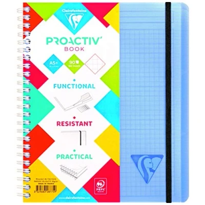 SET OF 5 NOTEBOOKS: ideal for school lists, schools and communities. FORMAT: a must-have for easy transport. ELASTIC CLOSURE: to avoid losing any document. SORTER POCKET: 3 integrated positions to store your documents. And a set of coloured adhesive labels to personalise the tabs. THICK, TRANSLUCENT POLYPRO COVERING: for high resistance to handling, with a grooved texture for an original feel and premium finish. SMOOTH WRITING: SUPERIOR QUALITY Clairefontaine White Velvet Vellum 90 g/m² paper with remarkable opacity and strength. REMOVABLE SHEETS: with micro-perforation for easy removal without tearing. REINFORCED WHITE DOUBLE SPIRAL: allows full opening, ideal for double-sided use. MADE IN FRANCE and PEFC CERTIFIED notebooks: for sustainable forest management