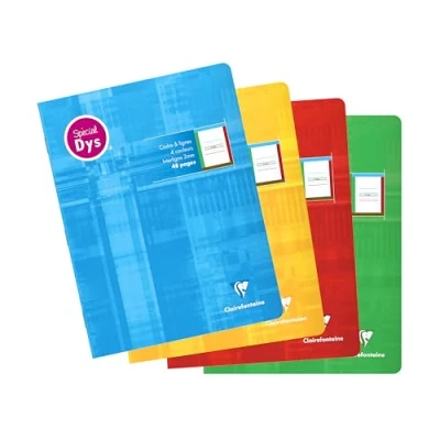 1 RANDOM COLOUR NOTEBOOK: sky blue, yellow, red or chlorophyll green. SMALL FORMAT: school size, easy to store in the schoolbag 4 COLOUR SETTINGS DYS SPECIAL: for learning to write, frame and line SKY - GRASS - EARTH - FIRE, line spacing 2 mm GENTLE WRITING: Clairefontaine White Velvet Vellum 90 g/m² paper of SUPERIOR QUALITY with remarkable opacity and strength. STITCHED BINDING: the best value for money. Pages are bound together with staples. COVER: washable laminated card for longer notebook life PEFC CERTIFIED: for sustainable forest management