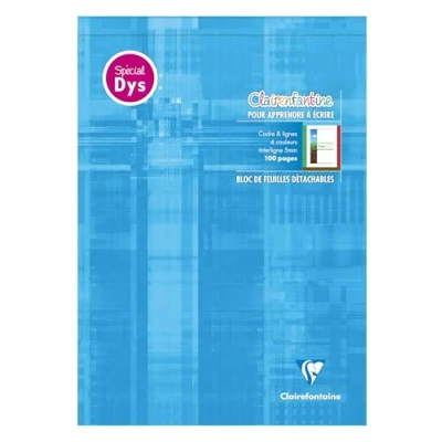 1 LIGHT BLUE NOTEPAD. GRAND FORMAT: the standard, for a larger surface for expression 4 COLOUR SETTINGS DYS SPECIAL: for learning to write, frame and line SKY - GRASS - EARTH - FIRE, 5 mm line spacing SMOOTH WRITING: SUPERIOR QUALITY Clairefontaine White Velvet Vellum 90 g/m² paper with remarkable opacity and strength. SHEETS: detachable for easy integration into a folder RIGID CARDBOARD BOTTOM: for comfortable note-taking, even without support. COVER: washable laminated card for longer notebook life PEFC CERTIFIED: for sustainable forest management