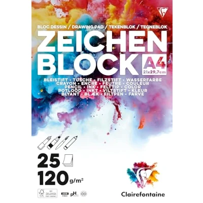Clairefontaine 70525B Bloc Collé Papier Dessin A4 21x29,7 cm 120g 25 Feuilles Blanc au Grain Très Léger Idéal Pour l'Illustration