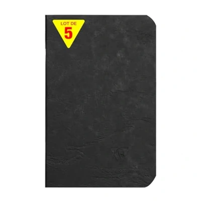 SET OF 5 BLACK NOTEBOOKS: ideal for school lists, schools and communities DURABLE AND RESISTANT: glossy card cover imitating the grain of leather, with a clean, authentic style! SWEET WRITING: SUPERIOR QUALITY Clairefontaine White Velvet Vellum 90 g/m² paper with remarkable opacity and strength. POCKET FORMAT: ultra-practical, take it with you wherever you go! MADE IN FRANCE and PEFC CERTIFIED: for sustainable forest management. 100% RECYCLABLE: plastic-free