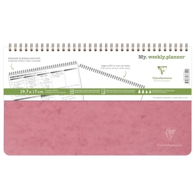 1 ANTIQUE PINK NOTEBOOK. LANDSCAPE FORMAT: easy to place in front of your keyboard Undated DESKTOP WEEKLY: on the front of the sheets and DOT rule (matrix composed of dots spaced 5 mm apart) on the back for free note taking. DURABLE AND RESISTANT: glossy card cover imitates the grain of leather, for a clean, authentic look! REINFORCED DOUBLE SPIRAL: allows full opening, ideal for double-sided use of sheets SMOOTH WRITING: SUPERIOR QUALITY Clairefontaine White Velvet Vellum 90 g/m² paper with remarkable opacity and strength. REMOVABLE SHEETS: micro-perforated for easy removal without tearing. 100% RECYCLABLE: plastic-free and FSC-certified for responsible forest management