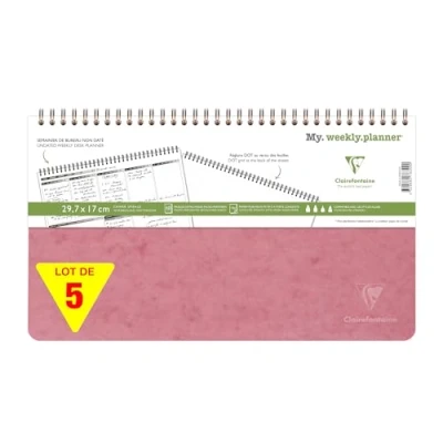 SET OF 5 ANTIQUE PINK COLOUR NOTEBOOKS, ideal for school lists, schools and communities. LANDSCAPE FORMAT: easy to place in front of your keyboard Undated DESKTOP WEEKLY: on the front of the sheets and DOT rule (matrix composed of dots spaced 5 mm apart) on the back for free note taking. DURABLE AND RESISTANT: glossy card cover imitates the grain of leather, for a clean, authentic look! REINFORCED DOUBLE SPIRAL: allows full opening, ideal for double-sided use of sheets SMOOTH WRITING: SUPERIOR QUALITY Clairefontaine White Velvet Vellum 90 g/m² paper with remarkable opacity and strength. REMOVABLE SHEETS: micro-perforated for easy removal without tearing. 100% RECYCLABLE: plastic-free and PEFC-certified for sustainable forest management