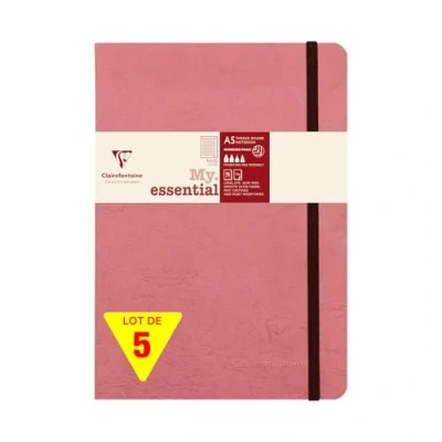 SET OF 5 ANTIQUE PINK NOTEBOOKS, ideal for school lists, schools and communities. SMALL FORMAT: a must-have, easy to transport SHEETS: 184 numbered pages + 8-page table of contents. The last 16 pages are micro-perforated and detachable. Customisable pre-printed cover pages DURABLE AND RESISTANT: glossy card cover imitating the grain of leather, with a sleek, authentic style! COMFORT AND QUALITY: thread stitching for suppleness, durability and perfect flat opening 2 STORAGE POCKETS on back cover: for storing your documents. Matching ELASTIC CLOSURE: so you never lose a document. COMBINED PAGE MARKER RIBBON: for easy retrieval of the last page used. GENTLE WRITING: Clairefontaine Ivory Velvet Vellum 90 g/m² paper of SUPERIOR QUALITY with remarkable opacity and strength. 100% RECYCLABLE: plastic-free and PEFC-certified for sustainable forest management.