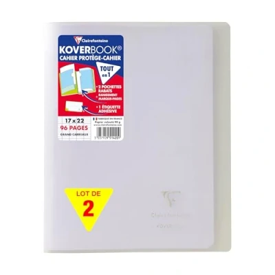 SET OF 2 COLOURLESS NOTEBOOKS: ideal for school lists, schools and communities. SMALL FORMAT: school format, easy to store in the schoolbag. STITCHED BINDING: good value for money, pages are bound together with staples. ECONOMICAL: notebook protector all in 1! Sturdy transparent polypro cover, waterproof and tear-proof PRACTICAL: 2 pocket flaps integrated into the cover to mark pages and store useful documents + 1 adhesive label to personalise the notebook WRITING SOFTNESS: 90 g/m² Clairefontaine White Velvet Vellum paper of SUPERIOR QUALITY with remarkable opacity and strength.TRIColour SETTING: red margin, purple lines and blue line spacing, for greater writing comfort. MADE IN FRANCE and PEFC CERTIFIED: for sustainable forest management