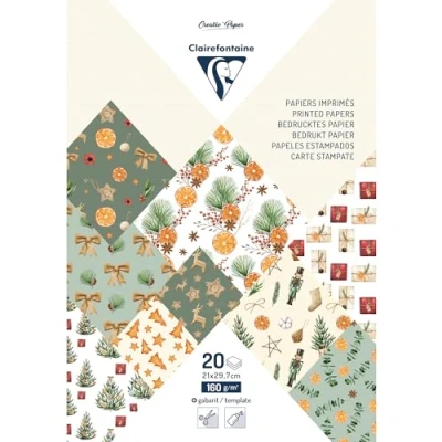 Clairefontaine 95547C PRINTED PAPER BLOCK, A4 (21x29.7cm), 20 patterned sheets 160g + 1 creative idea, vitaminized Christmas