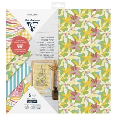 CONTAINS: This pack contains 5 sheets of 200gsm printed cutting paper in 30.5x30.5cm format. NUMBER OF PATTERNS: 5 different patterns printed on one side This pack is THE essential companion for all creative adventures: cards, decorations, accessories and much more. Paper can be embossed, decorated, cut, creased, folded... for all kinds of craft projects. Printed paper adapts perfectly to cutting requirements, whether with popular cutting machines or other craft tools. Tip: We suggest you use the fine-tipped blade, material thick watercolour paper 300gsm) FRENCH COMPANY: in tune with your needs and requirements, the Clairefontaine brand offers innovative, high-quality and environmentally-friendly products to enhance your imagination and creativity.