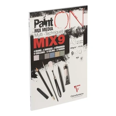 Clairefontaine 960067C PaintON MIX9 Multi technique Glued Pad 27 Sheets Drawing Paper Assorted with 9 Papers x3 A6 10.5x14.5 cm 250g