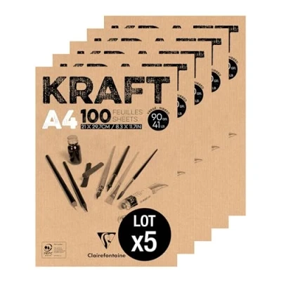 Clairefontaine 96545Cpack Un paquet de 5 Blocs Encollés Papier Kraft 100 Feuilles Vergé Brun A4 21x29,7 cm 90g Double Face Pour le Croquis et Dessin