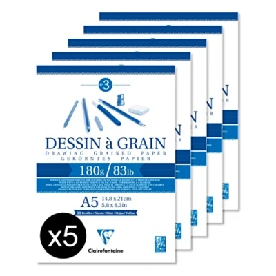 Clairefontaine 96626C Glued Grain Drawing Paper Pad 30 Sheets Marked A5 14.8 x 21 cm 180g Pack of 5 pads