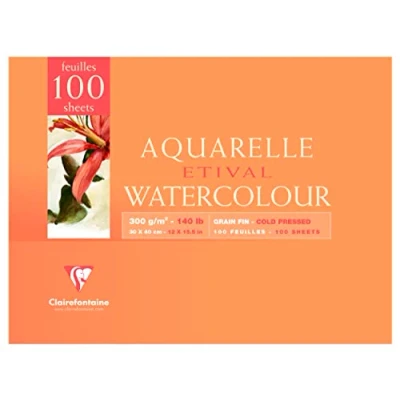 Clairefontaine 96788C Etival 2 Sides Glued Pad 100 Sheets White Watercolor Paper 100% Cellulose Fine Grain Study Quality 30x40 cm 300g