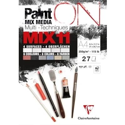 Clairefontaine 976011C Bloc Collé PaintON MIX11 Multi Techniques A4 21x29,7 cm 250g 27 Feuilles Papier Dessin Assorti de 11 Papiers
