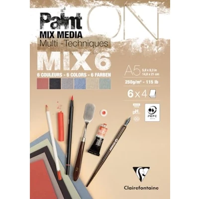 Clairefontaine 976014C Bloc Collé PaintON MIX6 Multi Techniques A5 14,8x21 cm 250g 24 Feuilles Papier Dessin Assorti de 6 Papiers