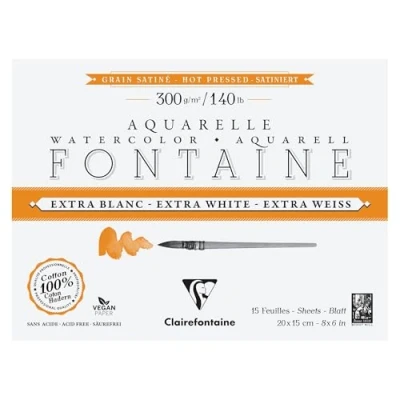 Clairefontaine 976018C Bloc Encollé 4 Côtés Fontaine Extra Blanc 15 Feuilles Papier Aquarelle 100% Coton Grain Satiné Qualité Professionnelle 20x15cm 300g