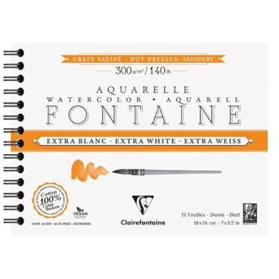 Clairefontaine 976030C Spiral Album Fountain Extra White 12 Sheets of Watercolour Paper 100% Satin Grain Cotton Professional Quality 18 x 24 cm 300 g