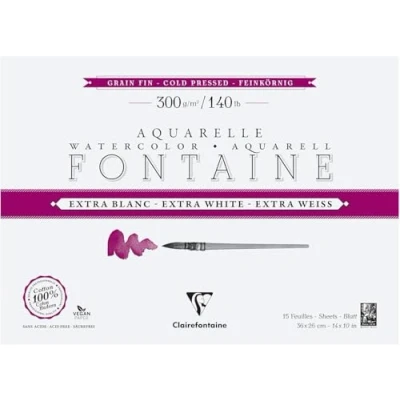 Clairefontaine 976041C Bonded Pad 4 Sides Fountain Extra White 15 Sheets of Watercolour Paper 100% Fine Grain Cotton Professional Quality 36 x 26 cm 300 g
