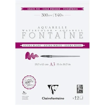 AmazonFONTAINE EXTRA WHITE 100% COTTON 300g PAPER: this extra white watercolour paper is of professional quality. Its extra white colour is unique, giving the pigments stability and brightness. FINE GRAIN: this fine-grained, even paper is very easy to use. Its versatile surface, neither too smooth nor too rough, is suitable for most techniques WATERCOLOUR: this paper is designed for wet techniques such as watercolour. Thanks to its high weight, it has excellent water absorption capacity and allows for repentance (the ability to go back over your work by erasing traces of paint) A3 SIZE: this pad is glued on both sides, making it economical and allowing the paper to remain taut while you paint, preventing it from warping ACID-FREE AND VEGAN: this paper is acid-free and pH neutral for perfect preservation of watercolours over time. The colours will retain their brightness. In addition, its double gluing is plant-based