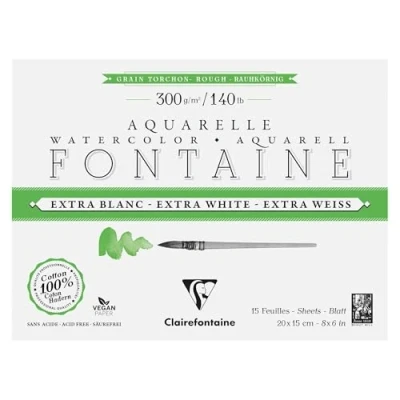 Clairefontaine 976078C Bloc Encollé 4 Côtés Fontaine Extra Blanc Grain Torchon 15x20cm 300g 15 Feuilles Papier Aquarelle 100% Coton Qualité Professionnelle