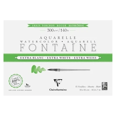 Clairefontaine 976079C Bloc Encollé 4 Côtés Fontaine Extra Blanc Grain Torchon 18x26cm 300g 15 Feuilles Papier Aquarelle 100% Coton Qualité Professionnelle