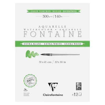 Clairefontaine 976082C Bloc Encollé 4 Côtés Fontaine Extra Blanc Grain Torchon 31x41cm 300g 15 Feuilles Papier Aquarelle 100% Coton Qualité Professionnelle