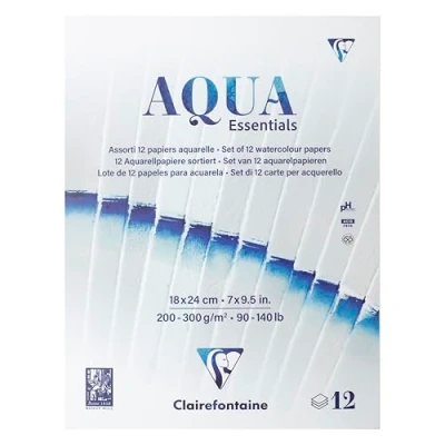 Clairefontaine 976098C Bloc Encollé Aqua Essential 18x24 cm Assortiment de 12 Papiers Aquarelle Idéal Pour la Technique Humide