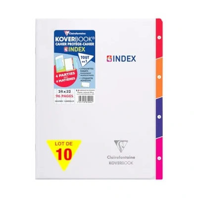 SET OF 10 COLOURLESS NOTEBOOKS: ideal for school lists, schools and communities. MAXI FORMAT: school size, ideal for slipping in or sticking on A4 sheets (21x29.7 cm) distributed in class ECONOMICAL: notebook protector all in 1 Solid cover in transparent, waterproof and tear-proof polypro PRACTICAL: 2 pocket flaps integrated into the cover to mark pages and store useful documents + 1 adhesive label to personalise the notebook MULTI-MATERIAL INDEXBOOK: for a lighter bag, 4 indexes = 4 different materials Stitched BINDING: good value for money. Pages are bound together with staples SWEET WRITING: SUPERIOR QUALITY Clairefontaine White Velvet Vellum 90 g/m² paper with remarkable opacity and strength. MADE IN FRANCE and PEFC CERTIFIED: for sustainable forest management